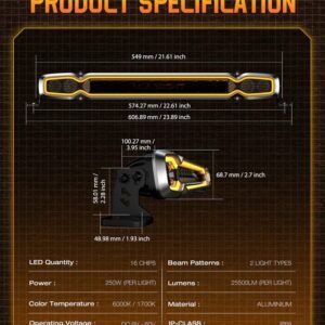 Novsight HALO Pro Series 20-Inch LED Light Bar features dynamic DRL modes and high-intensity LEDs for powerful and consistent illumination. Designed with a durable waterproof housing and modern styling, this auxiliary light bar is ideal for motorcycles, ATVs, and UTVs, providing enhanced visibility, safety, and performance for both off-road adventures and night driving.
