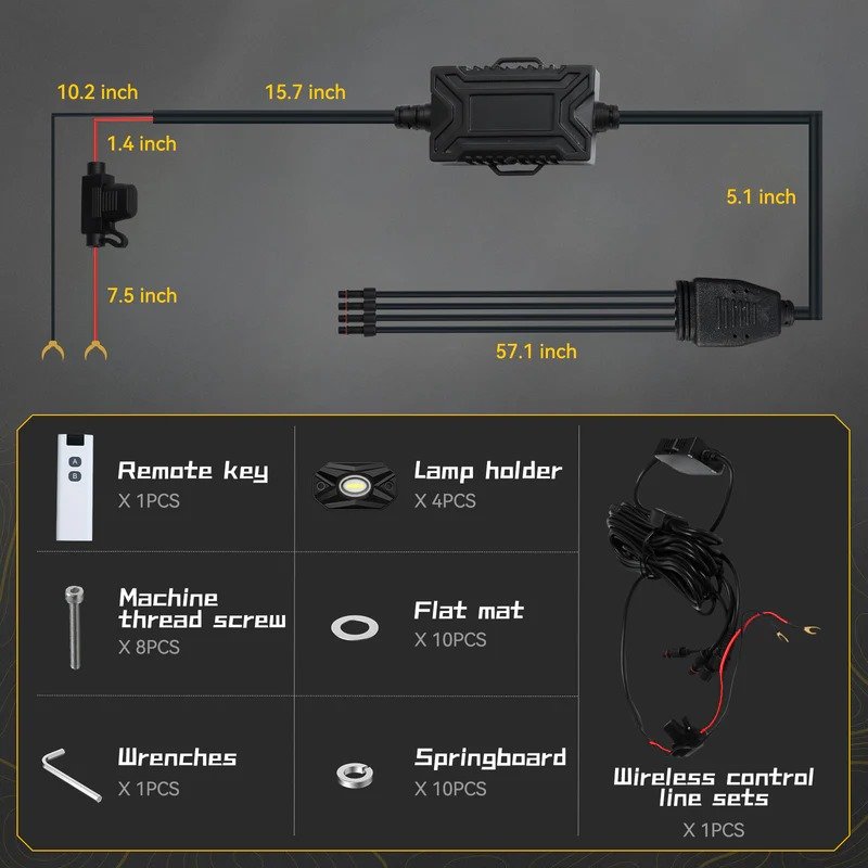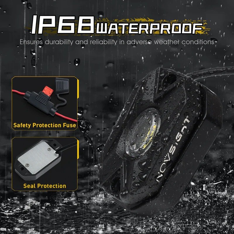 Novsight LED Rock Lights Kit (4 Pods – White Flood Beam) provides bright underbody illumination for enhanced visibility and style during off-road driving and night rides. Featuring a wide flood beam pattern and durable waterproof construction, these rock lights are perfect for trucks, ATVs, and UTVs, delivering reliable performance and rugged outdoor lighting in any terrain.